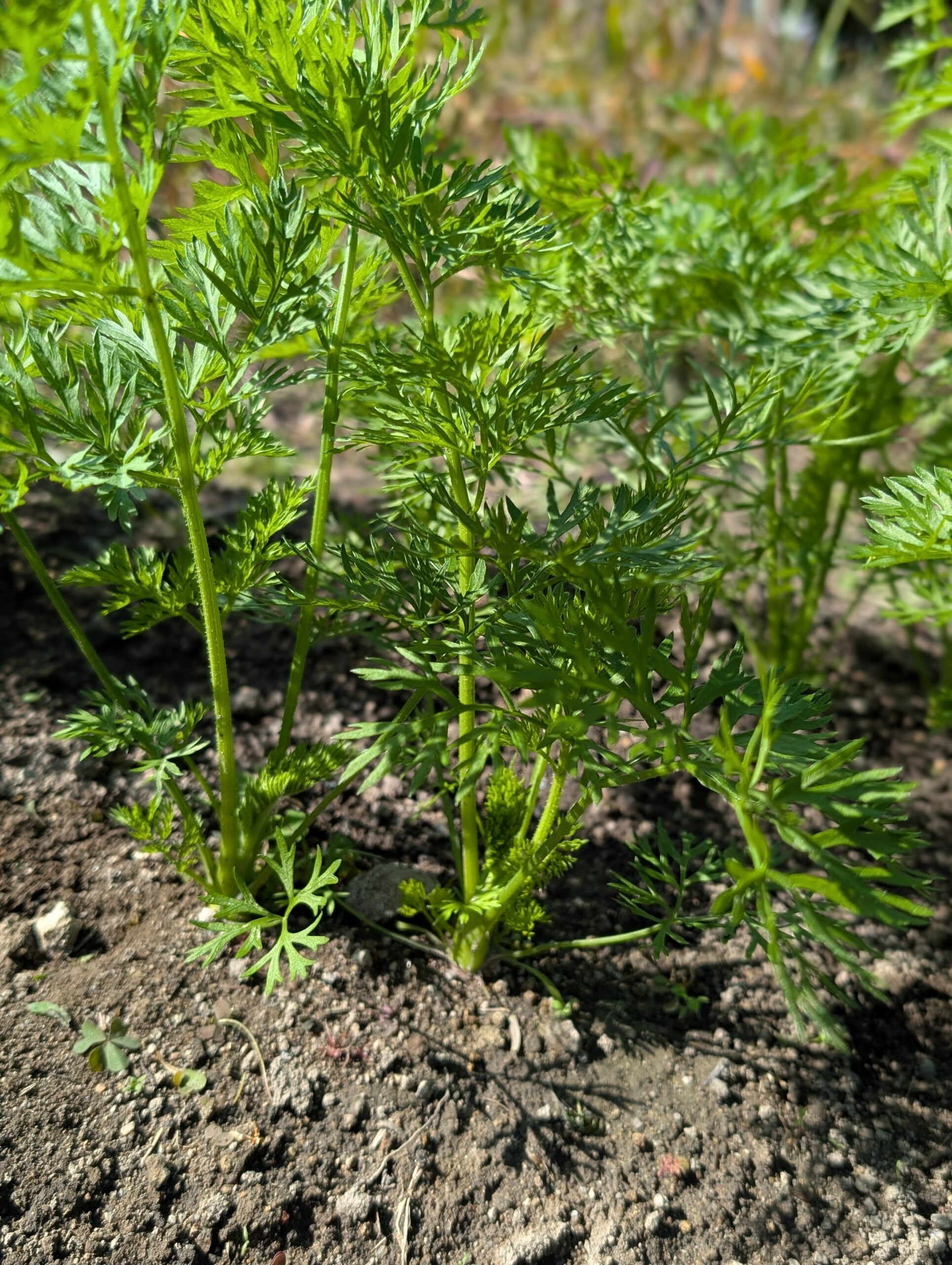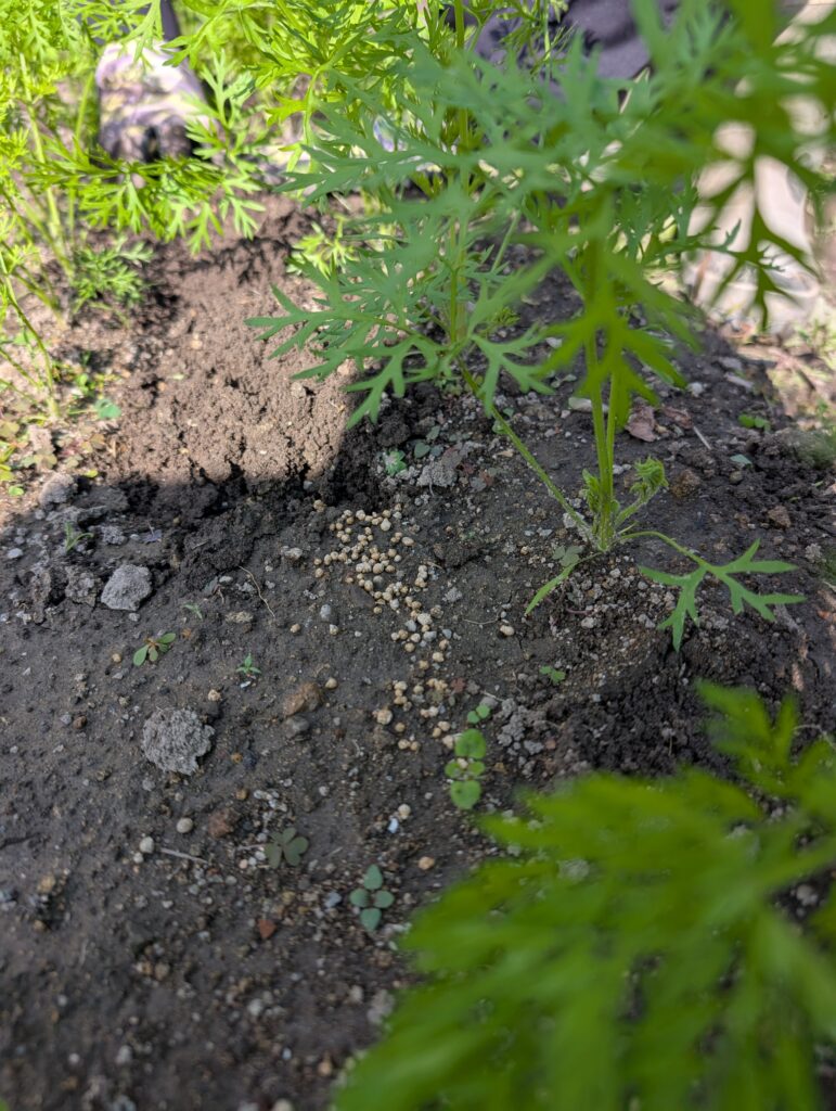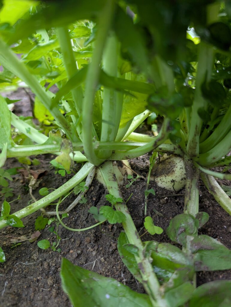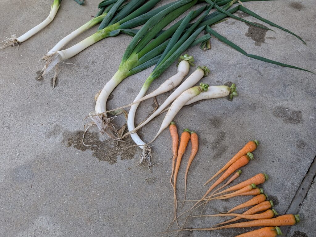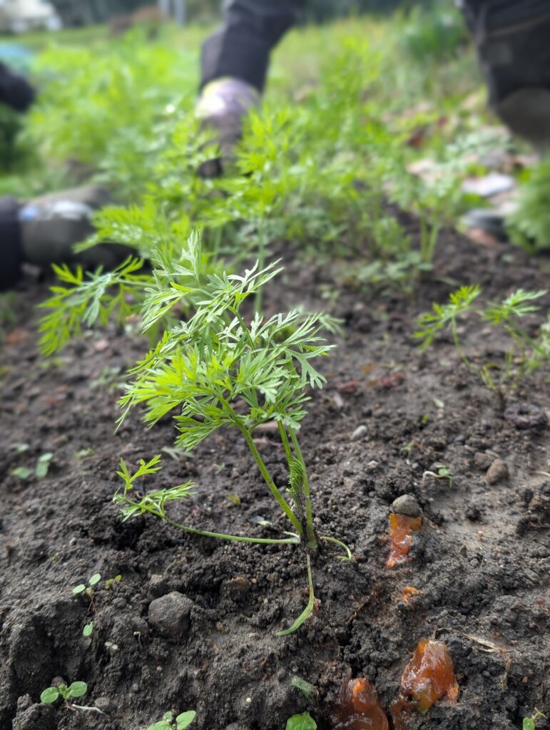 ニンジンは2回めの間引き。ダイコンは2本だけ残っていた間引き漏れを済ませ、岩津ネギも白い部分が育つように土寄せ。どれも良い感じに育っていて収穫が楽しみ。