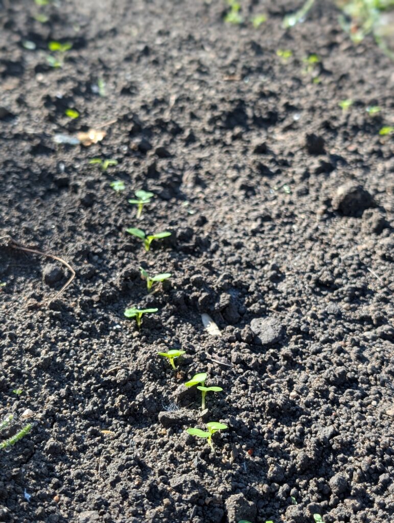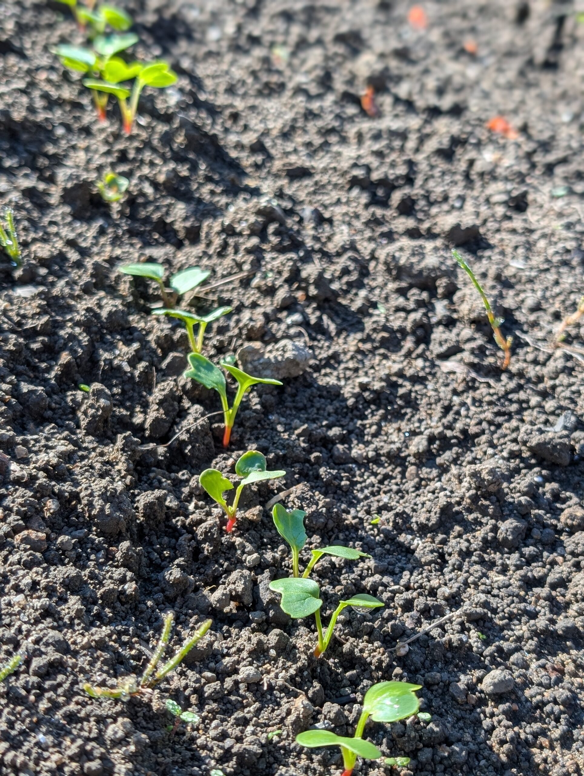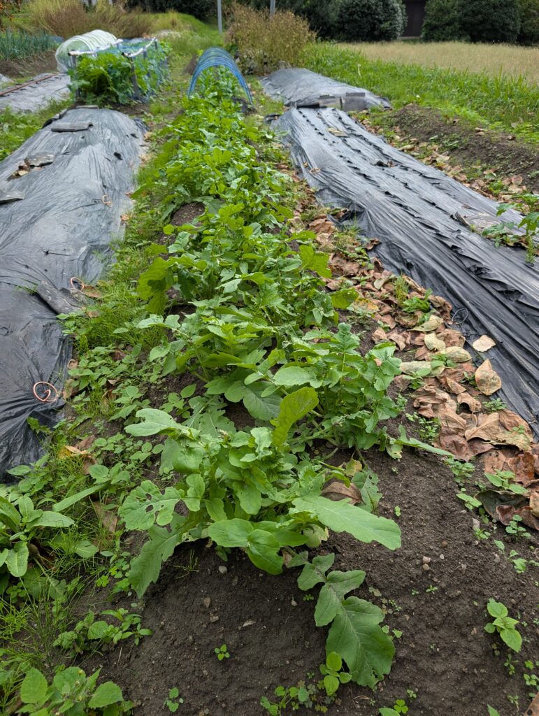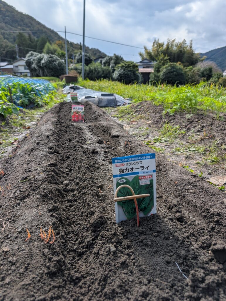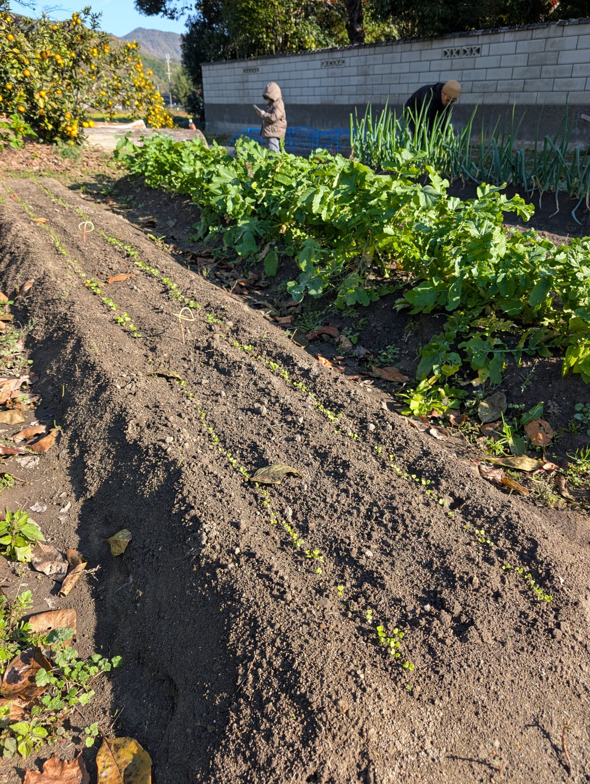 前回、種まきした秋野菜(コカブ、ホウレンソウ、サラダ水菜、ラディッシュ)の畝は、まだ芽が出たばかりなので、特に作業せず、簡単に雑草だけ草引きして完了。