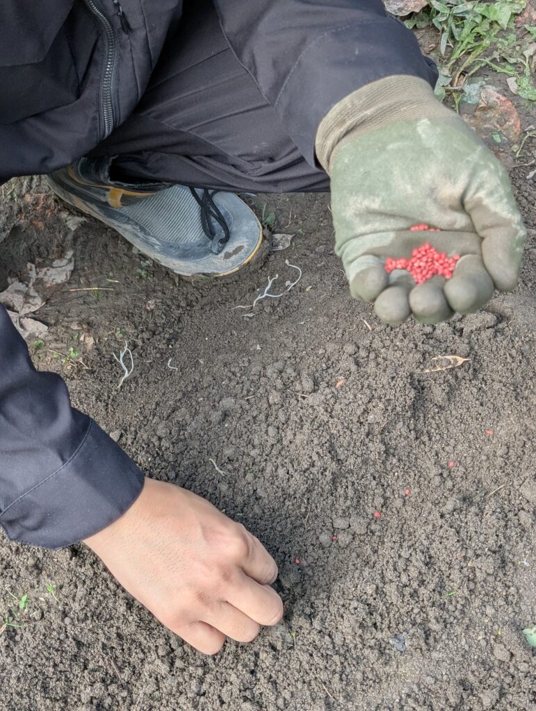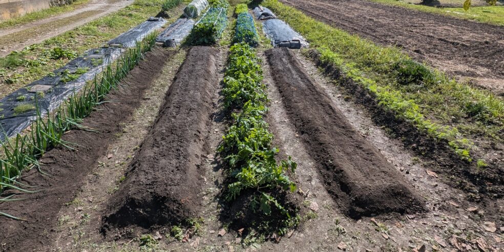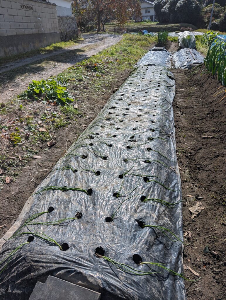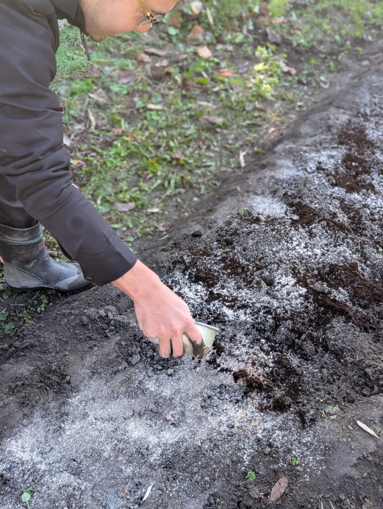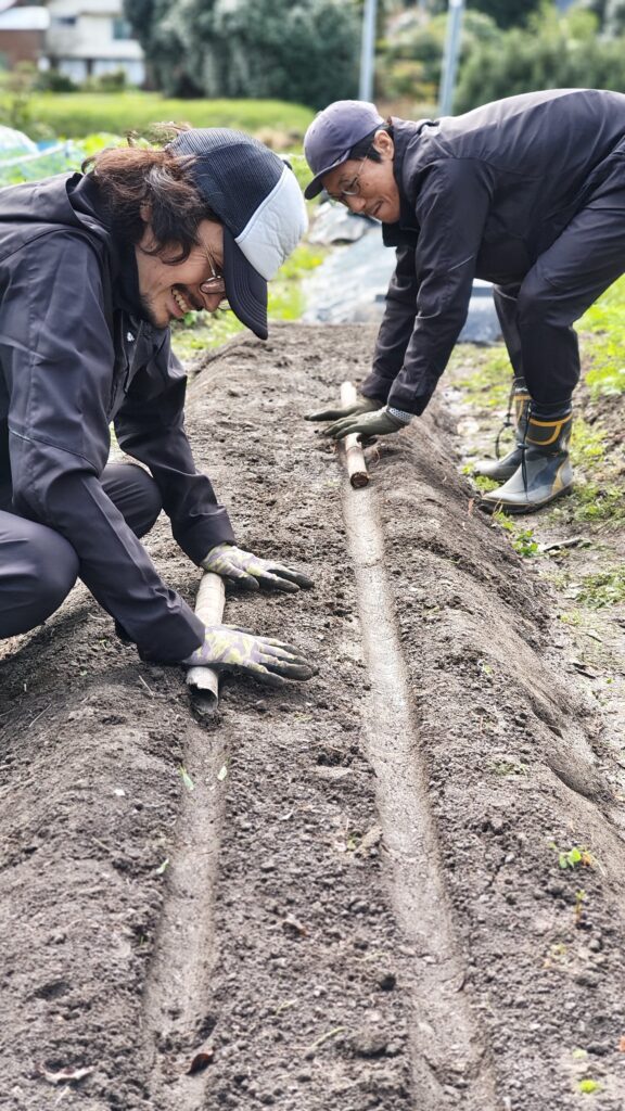 今回のメイン作業となるタマネギは、うねっこ→石灰→鍬で耕してしっかり畝立て。