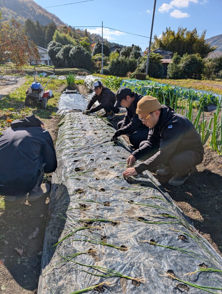 穴開きマルチに苗をセットしたら、全員で手分けして植え付け開始。