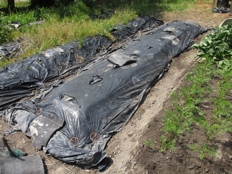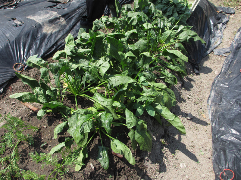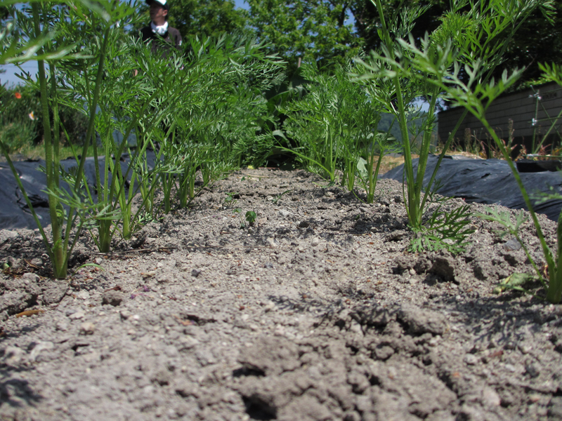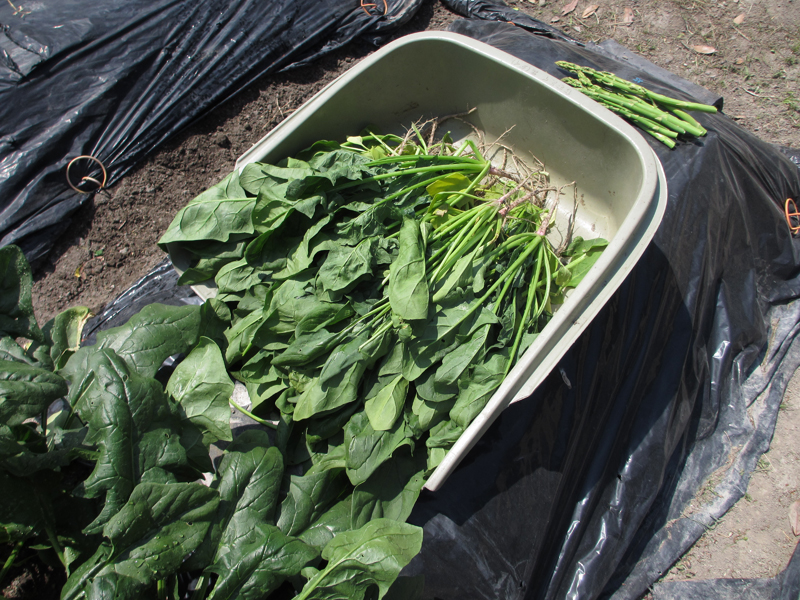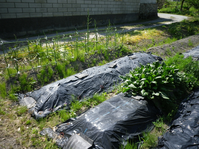 草引き後。アスパラガスは収穫、ホウレンソウとニンジンは間引きも済ませた後の写真です。