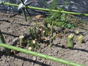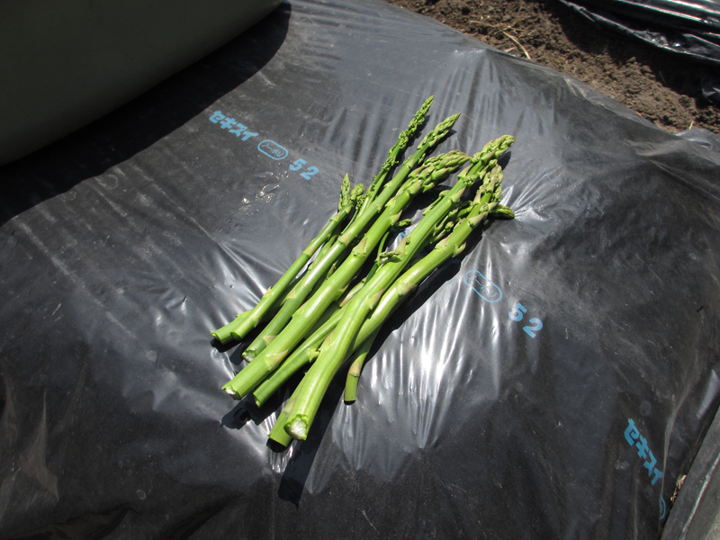 今回はアスパラガスの収穫、ホウレンソウとニンジンの間引き、ジャガイモの追肥、