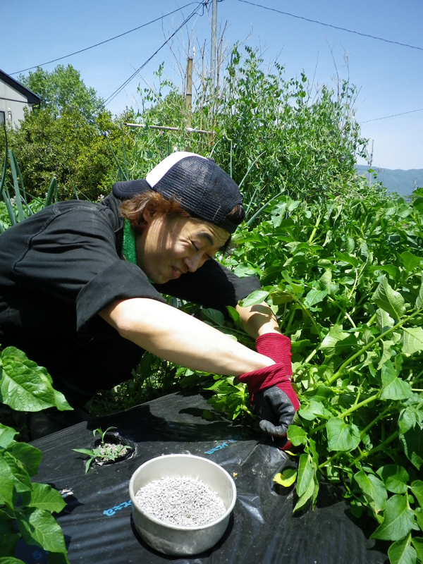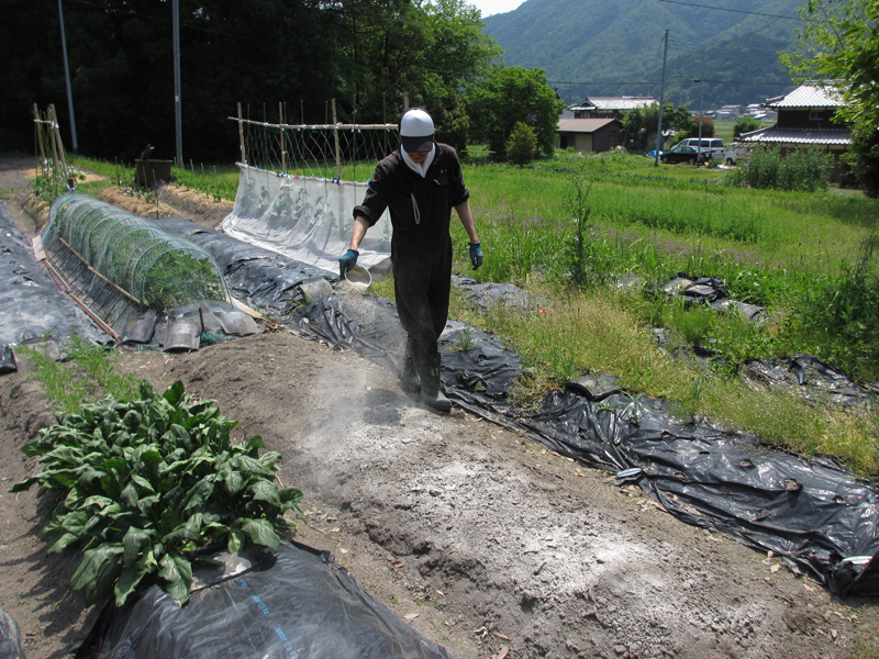 写真は石灰&肥料をまいてウネづくりの下準備をしている様子。
