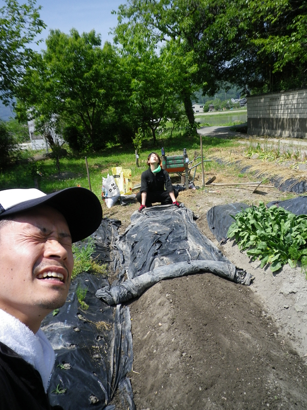 と思ったら次の写真はもうウネづくりが終わってマルチをかぶせる場面・・・。