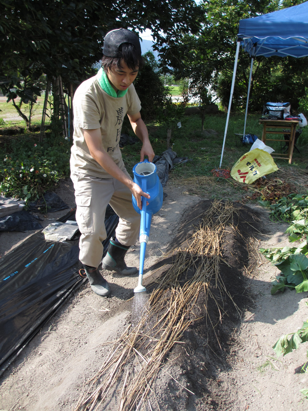 まいたあとは、種が風で飛んでしまわないようにわらを置いて、水やりもたっぷりと。
