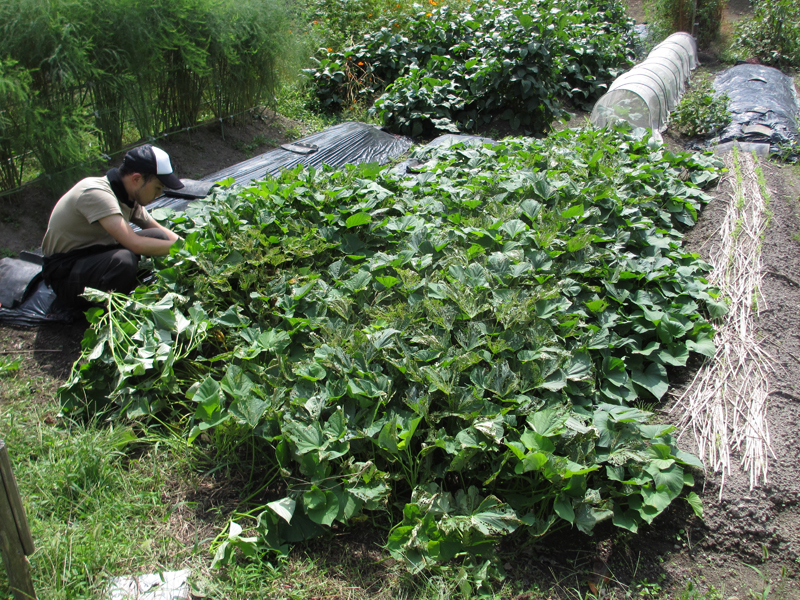 長すぎるツルは途中で切ったり、元のウネのツルに絡ませたりして、