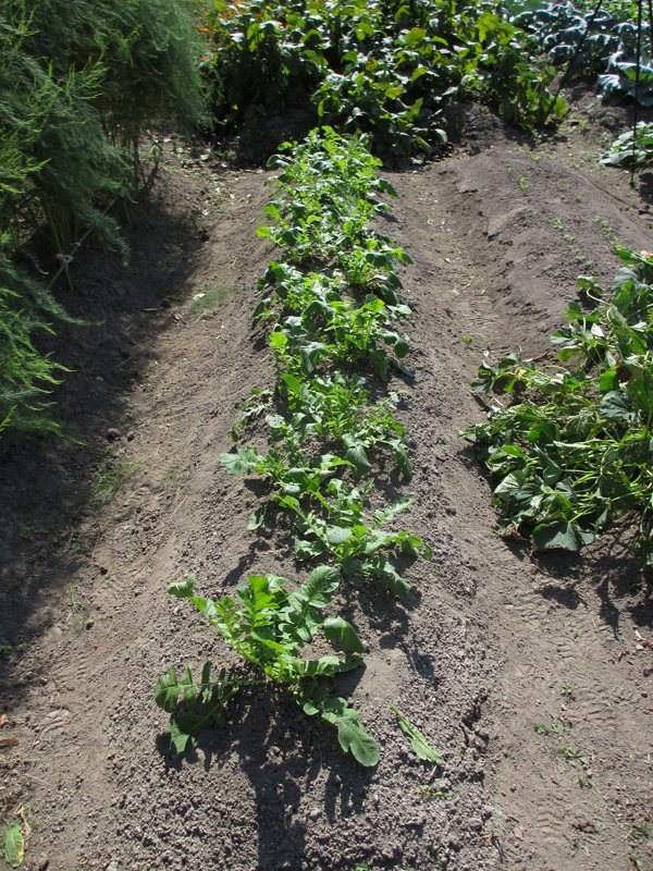 ダイコンは間引き、追肥、土寄せ、そして水やり。
