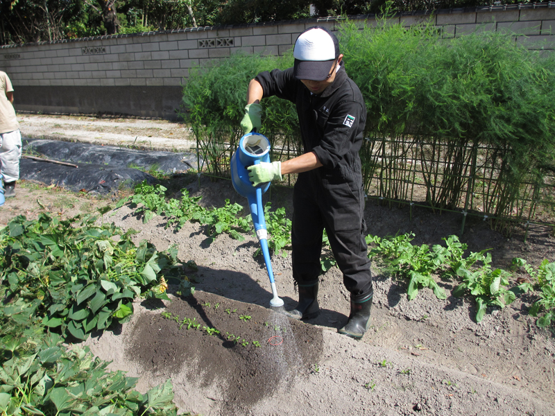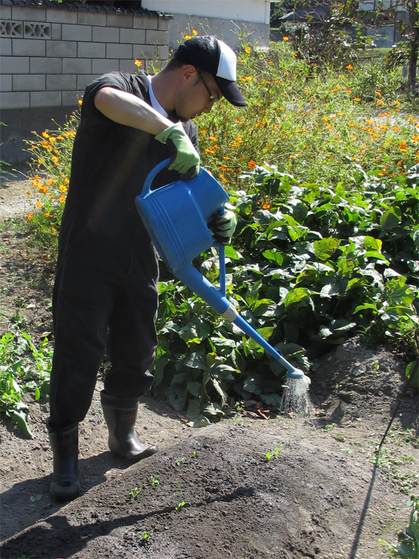 ミズナは間引き。(写真は水やり中のかわしまはん)