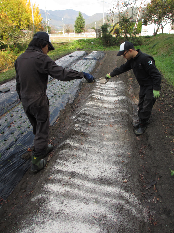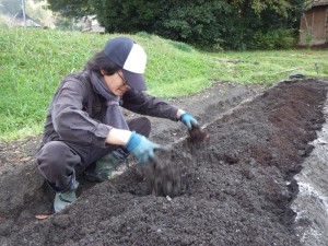 まずは牛ふんを散布。そしてクワでほぐしていきます。