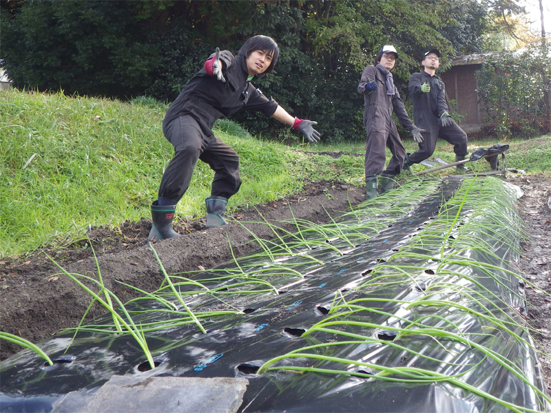 その後、穴あきマルチをかぶせ、穴に一つずつタマネギの苗を植えていきます。