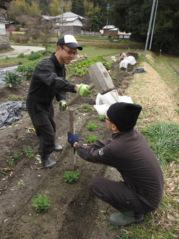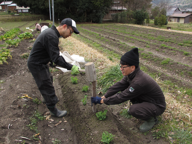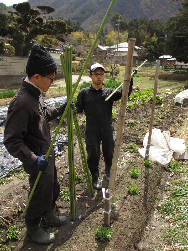 支柱全体を支えるための太めの竹、それを固定するための杭をウネにしっかりと打ち込みます。