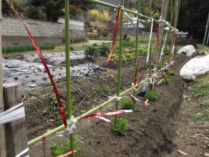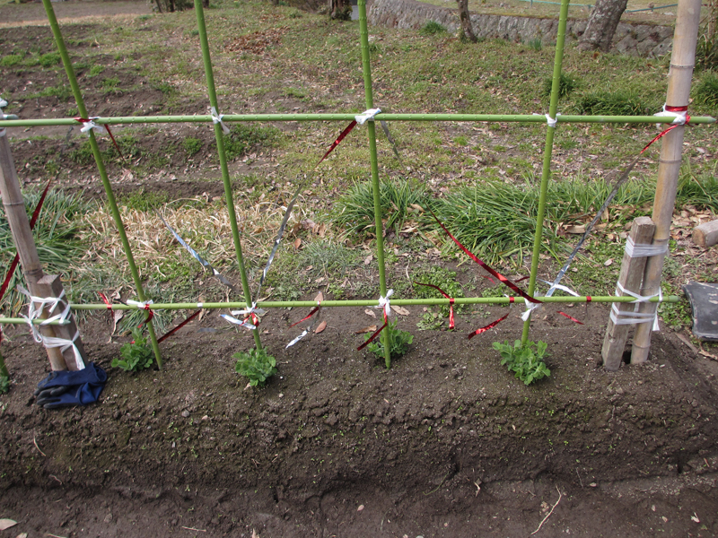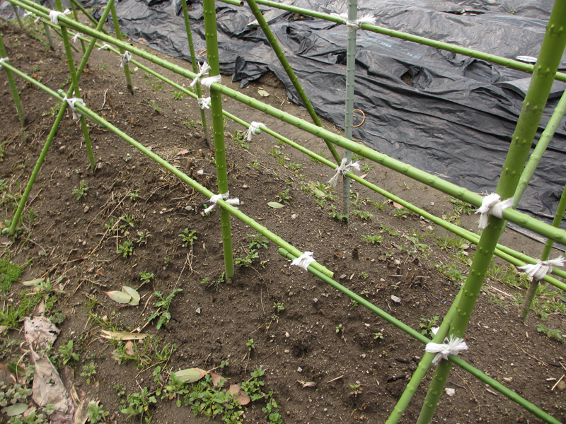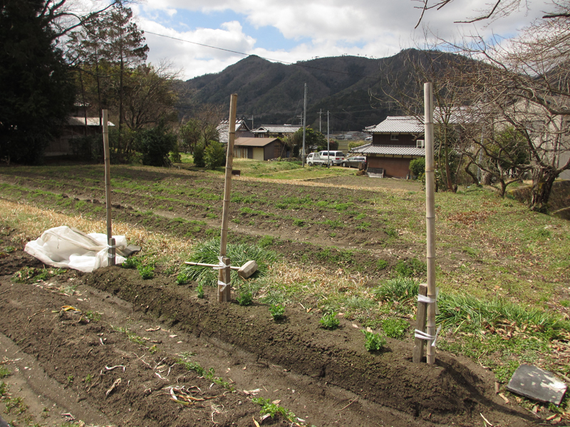 成長過程で伸びてくるツルを巻き付けさせるための支柱をウネに設置します。