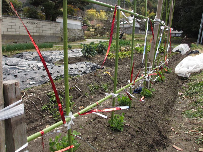 裏表で紅白になってるテープ、これは鳥よけのためのもの。