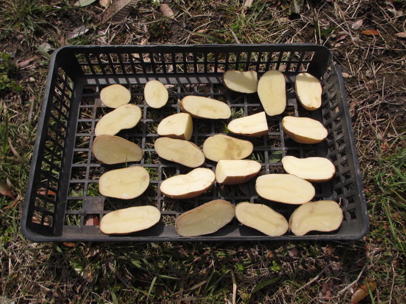 先ほどの種イモを、10cm掘ったくらいの穴に植えていきます。
