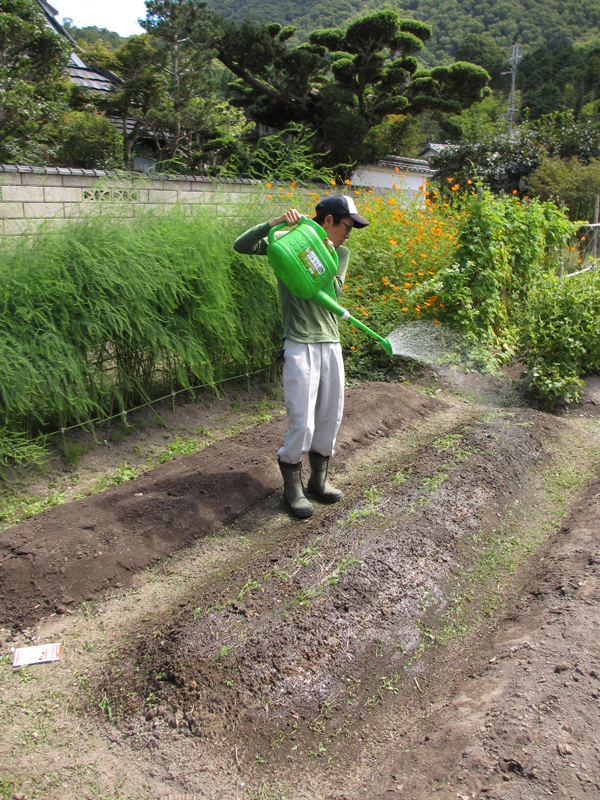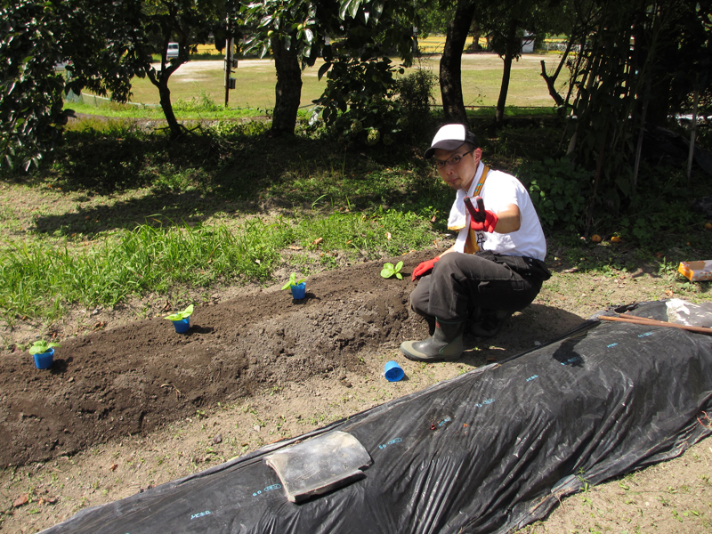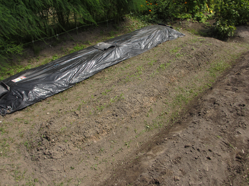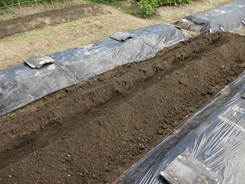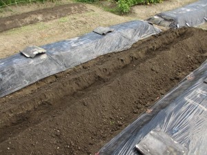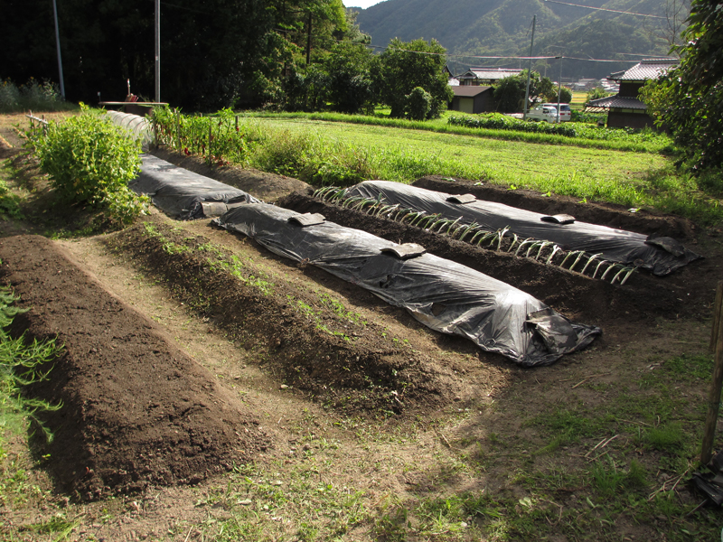 うち2本は石灰と肥料を混ぜ込んでマルチを敷き、次回以降の作業で葉ものやカブを育てる予定で、