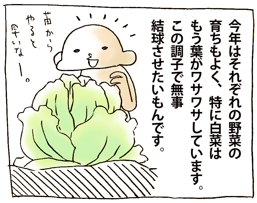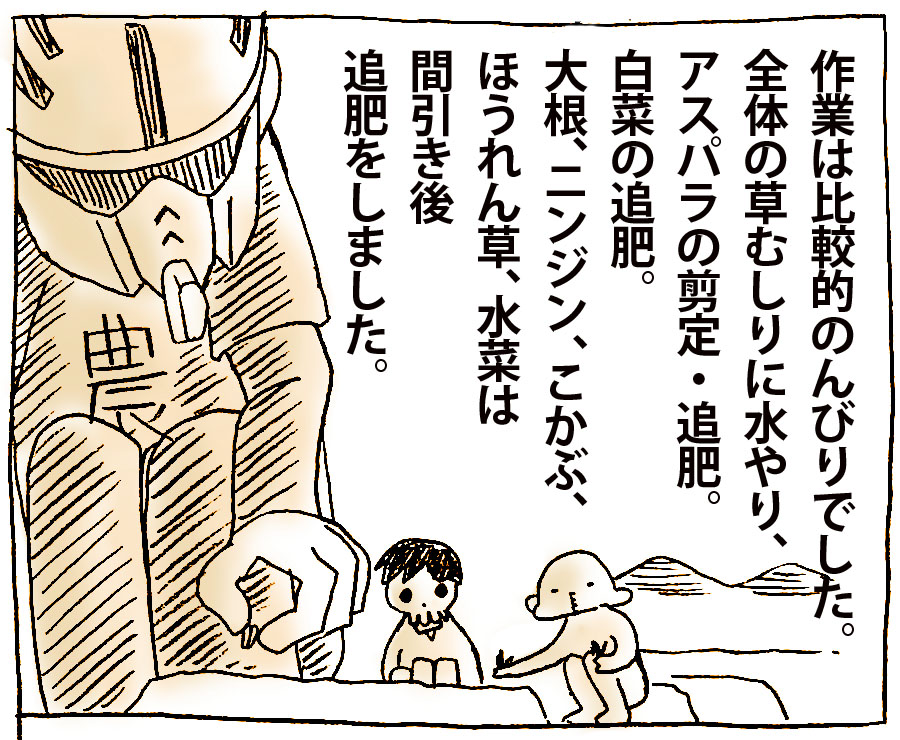 投稿日: 2014年10月19日2014年10月21日 カテゴリー 民家週報 【第7期・10月18日(土)】作業レポート 10月に入って朝夕はめっきり冷えるようになってきましたね。 いつもblogを書いてくれている幸田氏がお休みだったので、 今回の民家BLOGは川島が書きます。幸田氏のような軽妙な文章はボクには無理なので 今回だけ漫画風にいきたいと思います。 以下、野菜の写真です。 白菜。 大根。 小かぶ。 ほうれん草。 水菜。 にんじん。 最後にネギです。 という、感じの10月作業でした。 次回は11月中旬頃の作業になります。ではまた!