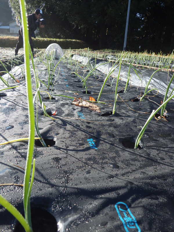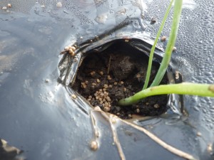 タマネギは苗が出ているマルチの穴から追肥をしていきます。
