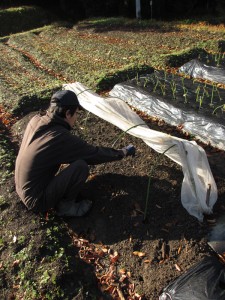 タマネギのウネの横、ホウレンソウ(2回目)とミズナの出来がイマイチではありませんか。