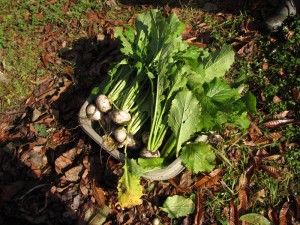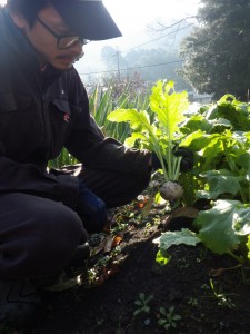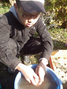 収穫した小カブを洗う。暖かくなってきたとはいえ、