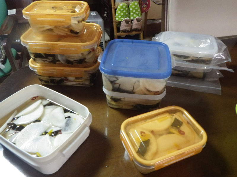 小カブ、昆布、ゆず、鷹の爪を交互にタッパに入れ、