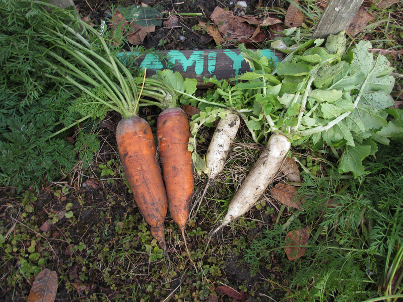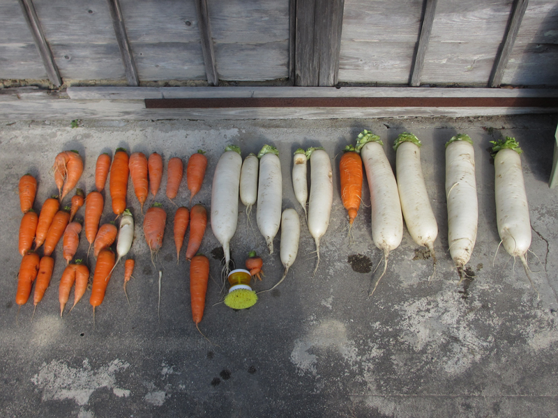 収穫したものをきれいに並べました。左はニンジン、右はダイコン・・・