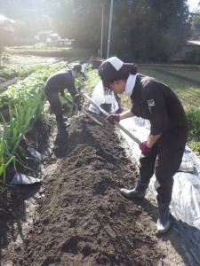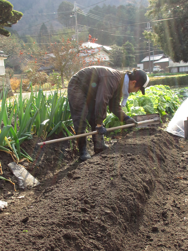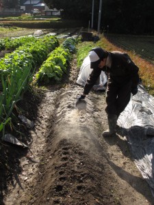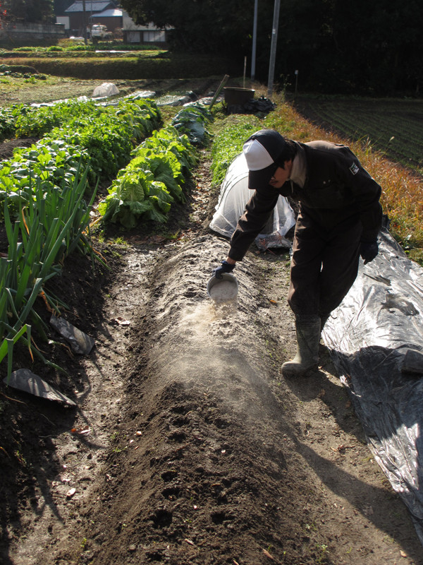 肥料をまいて、そして石灰を多めにまいてウネづくりをしました。